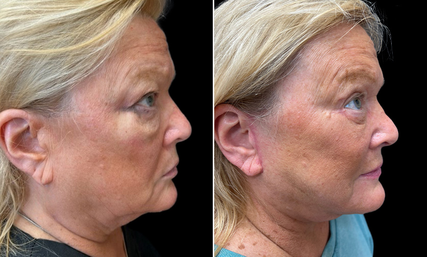Description: Bilateral upper and lower blepharoplasty, correction of festoons, septal window, septal reset, orbicularis muscle suspension, canthopexy, short scar temporal lift, face and neck lift, platysmaplasty, excision of subplatysmal fat.